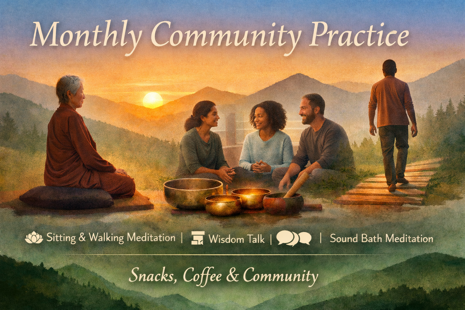 Our Monthly Community Practice is an in-person gathering that offers a gentle, grounded rhythm of shared practice. The evening includes alternating periods of sitting and walking meditation, a brief wisdom talk, and time for a group roundtable discussion. We close the gathering with a restorative sound bath meditation.